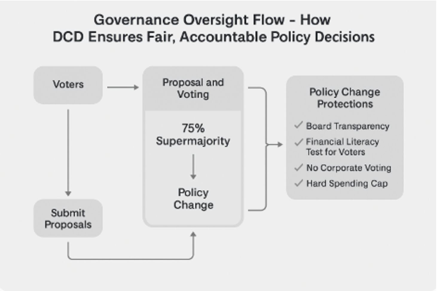 Major policy changes require a public referendum and a 75% supermajority vote – No governance body can unilaterally make drastic changes.