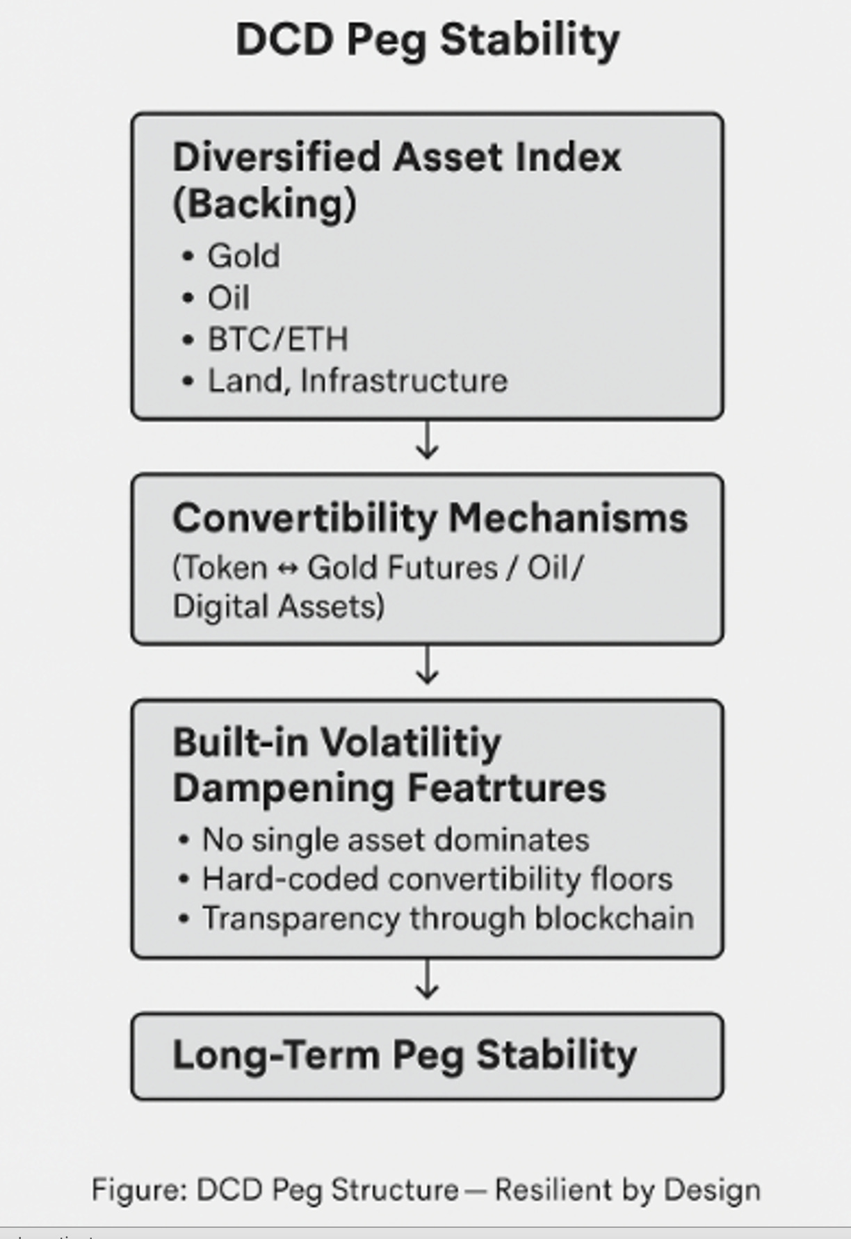 Loss of Trust (Peg Breaks, High Risk) – The highest-risk scenario, which has historically plagued fiat and past pegs, is all but eliminated through DCD’s asset-backed framework and enforced convertibility rules and blockchain rules and immutability.