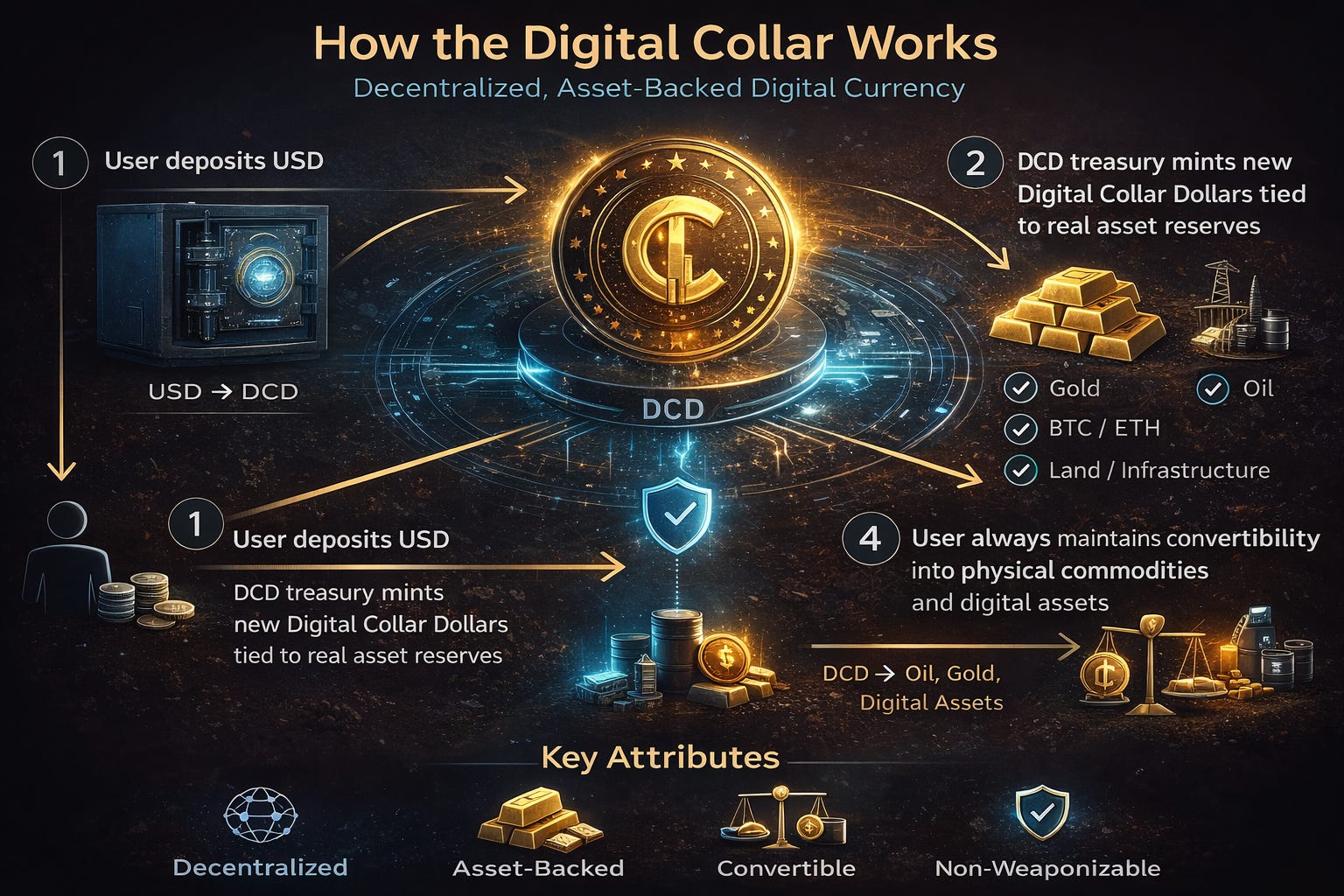 The Digital Collar (DCD) is not just another digital currency—it is the first decentralized, asset-backed digital reserve currency designed to ensure that money cannot be inflated away, manipulated, or controlled by any government or corporate entity. Unlike traditional fiat money, which can be printed endlessly, or Central Bank Digital Currencies (CBDCs), which give governments total financial surveillance and control, DCD is pegged to real, hard assets like gold, oil, and Bitcoin.