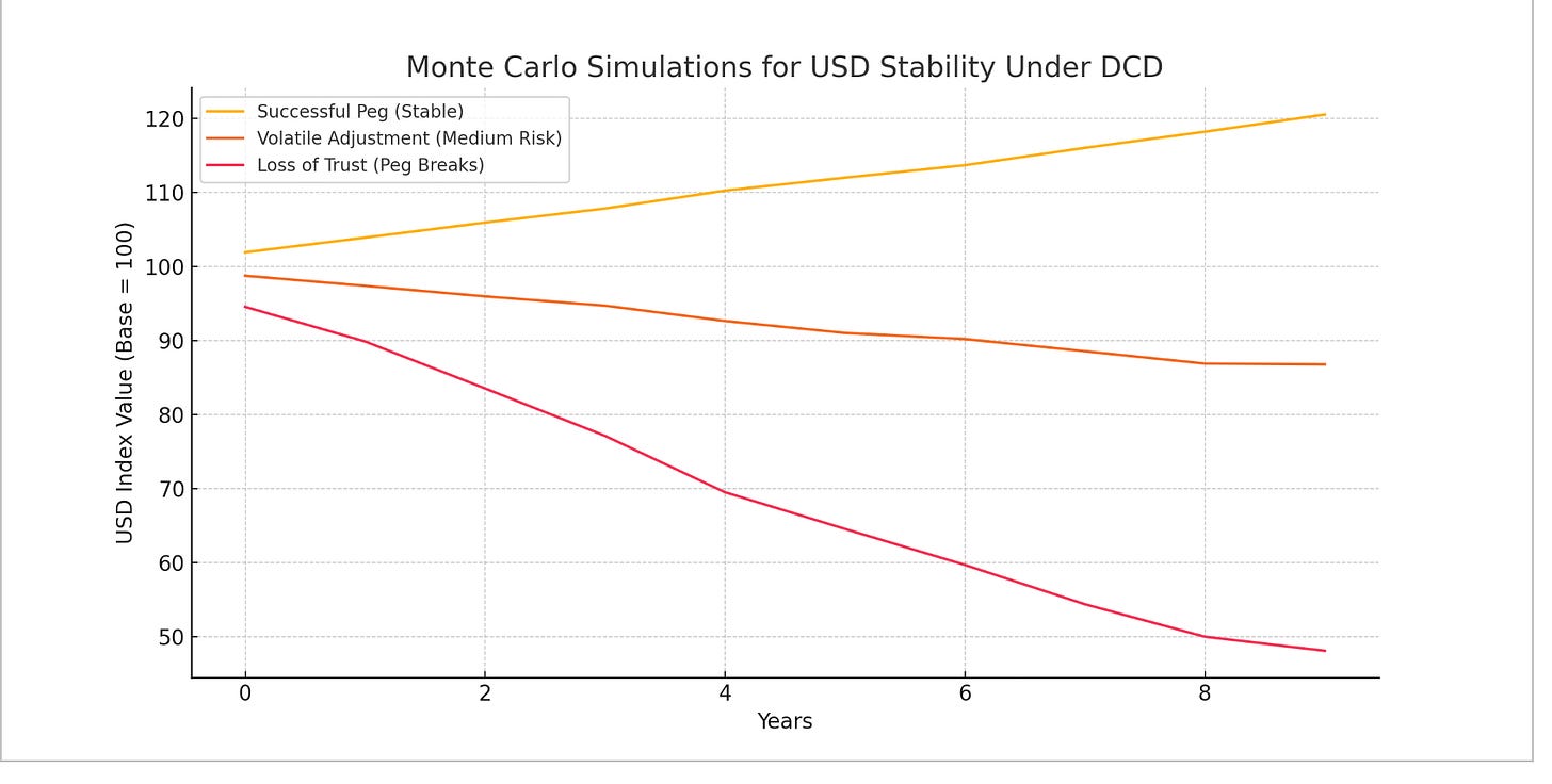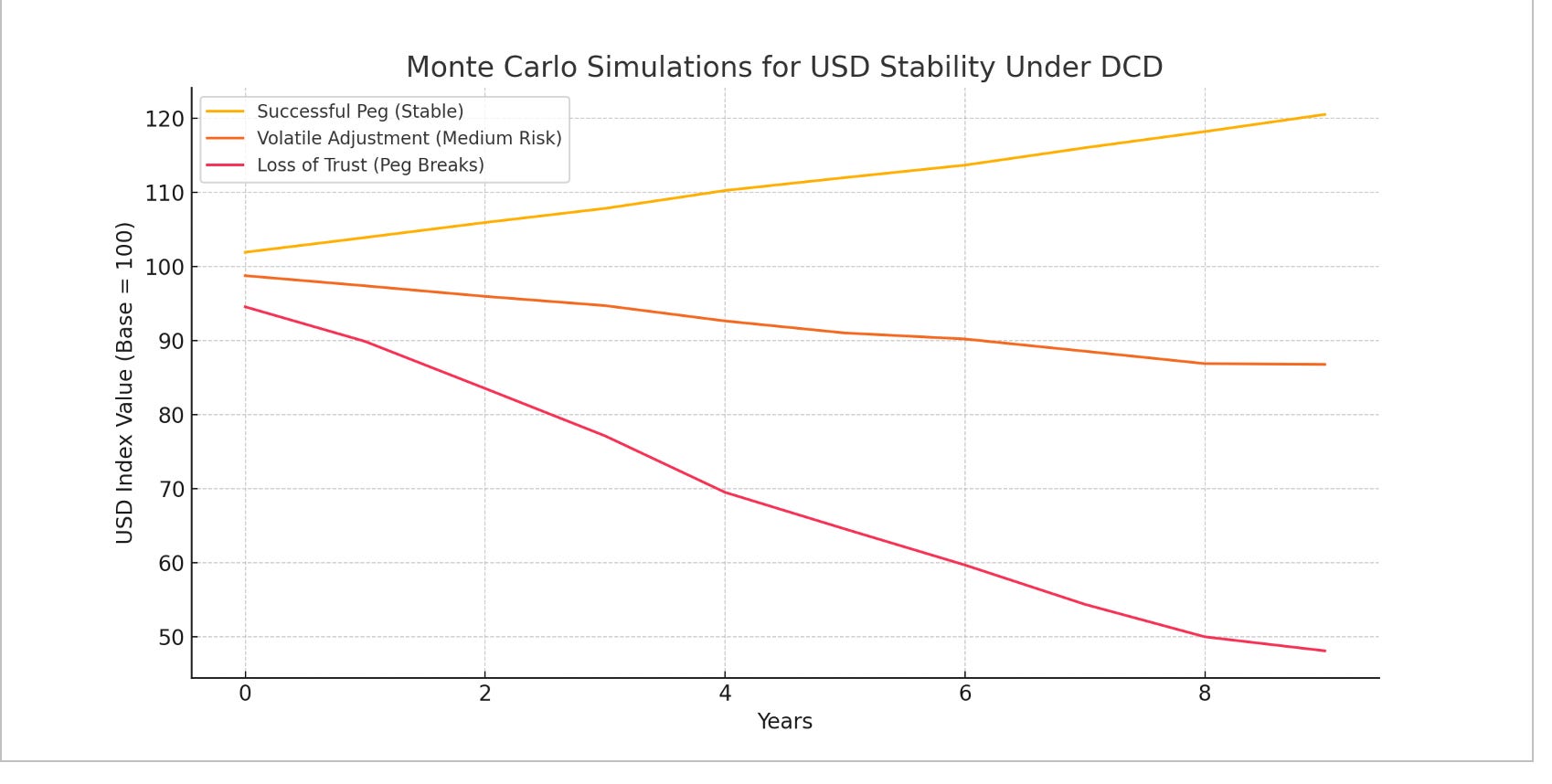 Successful Peg (Stable Scenario) – USD appreciates gradually as the Digital Collar stabilizes, supporting long-term confidence.