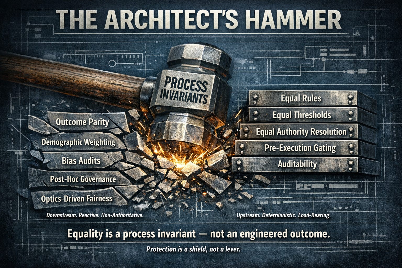 The Architect’s Hammer illustrates a simple systems truth: equality either exists in the rules before execution, or it does not exist at all.